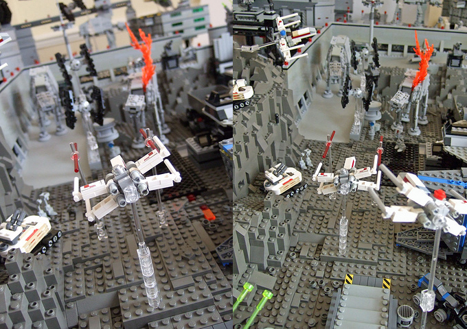 El caso que el hombre que ha hecho esto se ha inventado toda una historia para este diorama, que sólo representa una parte de una batalla mucho mayor. En las pocas fotos que os ponemos aquí, podeis distinguir algunos de los muchos detalles en los que ha incurrido el creador, como representar los disparos de turboláser y las bombas de los bombarderos TIE, o el vuelo de los cazas X sobre la instalación, entre otros.